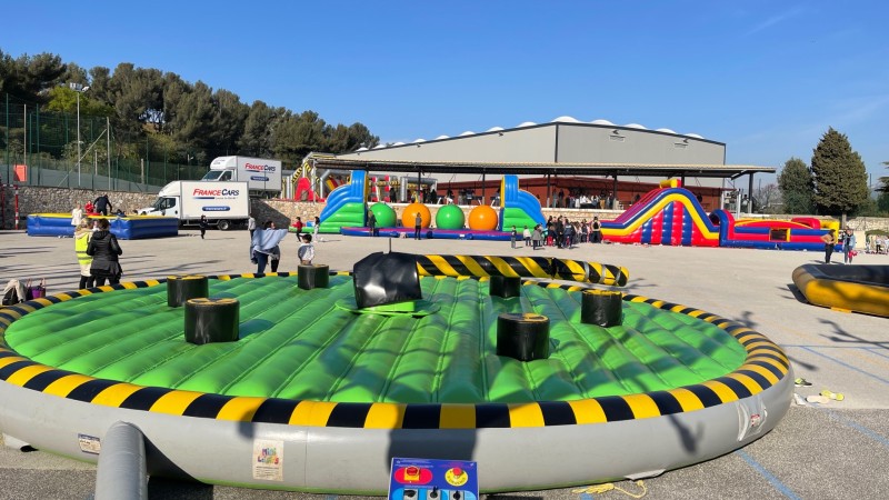Une très grosse installation de jeux gonflables nous attendait, il y en avait de toutes sortes, rodéo mécanique, la faucheuse infernale, le circuit gonflable avec les karting, les jeux gonflables récréatifs, trois gros parcours gonflables , quelques jeux gonflables sportifs et plusieurs stands de kermesse.